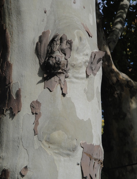Mediodía de domingo. Paseo a rostro descubierto por aceras inundadas de hojarasca. En el semáforo descubro un plátano espléndido. Su tronco dibuja aguas celestes, verdosas y pardas, marcas del pasado. El plátano conserva un follaje intenso ajeno a los vientos que presagian el invierno. Sus hojas de palmas anchas saludan a azoteas y farolas en una calle sin coches.