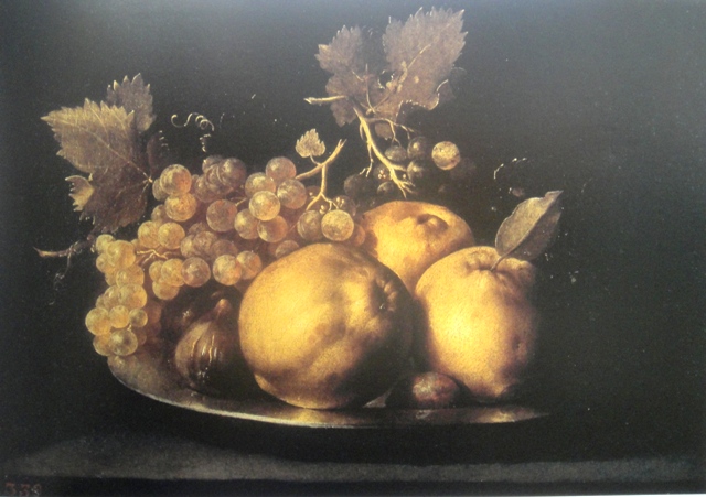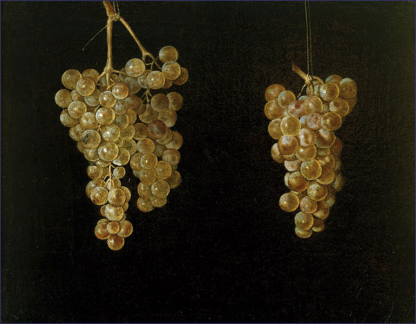 Entre los cuadros escojo un par de racimos cargados de uvas doradas que desprenden un tibio olor a vino dulce. (Juan Fernández  “El labrador”. Racimos de uvas suspensos. c.1630). Un cesto de frutos madurados al sol de la campiña francesa cuyo interior acoge zumos del estío. (Louise Mouillon. Cesto con melocotones y uvas. 1631).