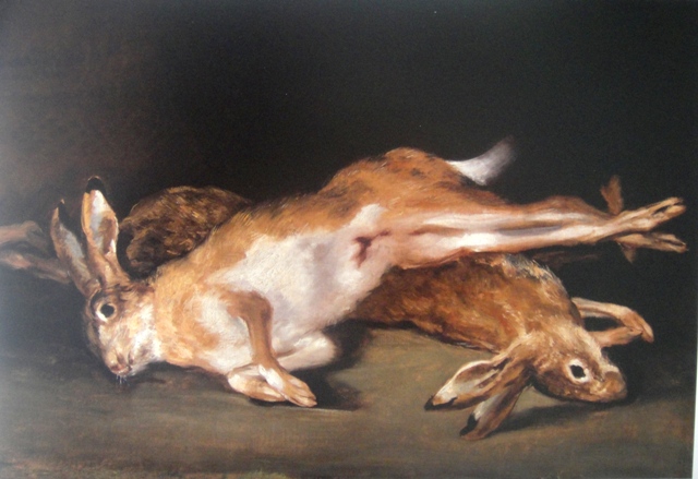 Las páginas hinchadas de sudores y lágrimas que preservan memorias del destino final de quien las dibujó con sus letras. (Anónimo. Bodegón con libros y reloj de arena. c. 1667). Y un par de liebres abatidas en pose hierática que recuerdan la crueldad de la guerra, uno de los doce bodegones que Goya realizó para el comedor de su casa madrileña. (Francisco de Goya. Liebres. c. 1808-1012)