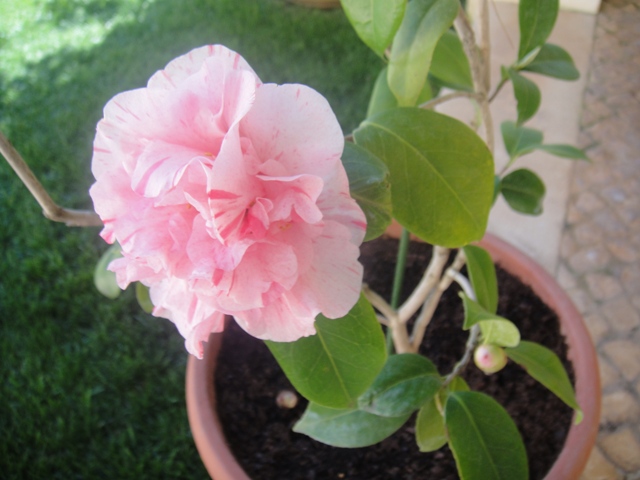 Mañana soleada.  Desayuno frente al jardín encendido de verdes bajo un añil espléndido. Me acerco al vivero de Dona Helena. Tras el portón un vergel de geranios, margaritas, rosas, claveles y naranjos.  Contra la pared glicinias, campánulas y buganvillas. Al fondo una maceta abandonada con un par de flores rosas y blancas. Dona Helena me comenta que vendieron docenas camelias pero que ya pasó su tiempo. Escojo unos geranios para la piscina, unas rosas  para la terraza y la última camelia para la entrada.