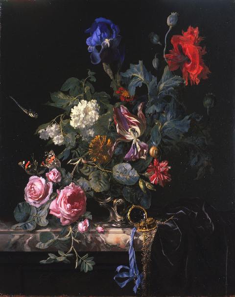 En la salida, jarrones de hogares nobles de un país enamorado de las flores. Me detengo frente a una composición de hojas salpicada de rosas, blancos y carmines con notas cargadas de lapislázuli entre mariposas, caracoles y libélulas. (Willem van Aelst. Florero y reloj de bolsillo. 1663).  Los pétalos perfectos de los claveles, rosas y camelias que descubrí esta mañana en el vivero de dona Helena.  Naturalezas vivas. Cuatrocientos años cautivando pinceles y letras.