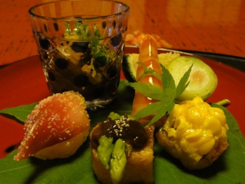La comida espectacular. Desayuno tradicional y cena Kaiseki, la alta cocina japonesa. A las siete una señora en kimono se deslizaba por el cuarto y te servía a intervalos once platos exquisitos. Se arrodillaba para abrir y cerrar la puerta y cada vez que servía la mesa. Siempre con la misma cara sonriente, la máxima expresión del omotenashi, la legendaria hospitalidad japonesa. Más que una cena parecía un cuadro. El kaiseki es un arte que combina sabores, texturas y colores de cada alimento, siempre frescos, de estación y locales. Son platos pequeños pero que llenan muchísimo. Daba pena comérselos.