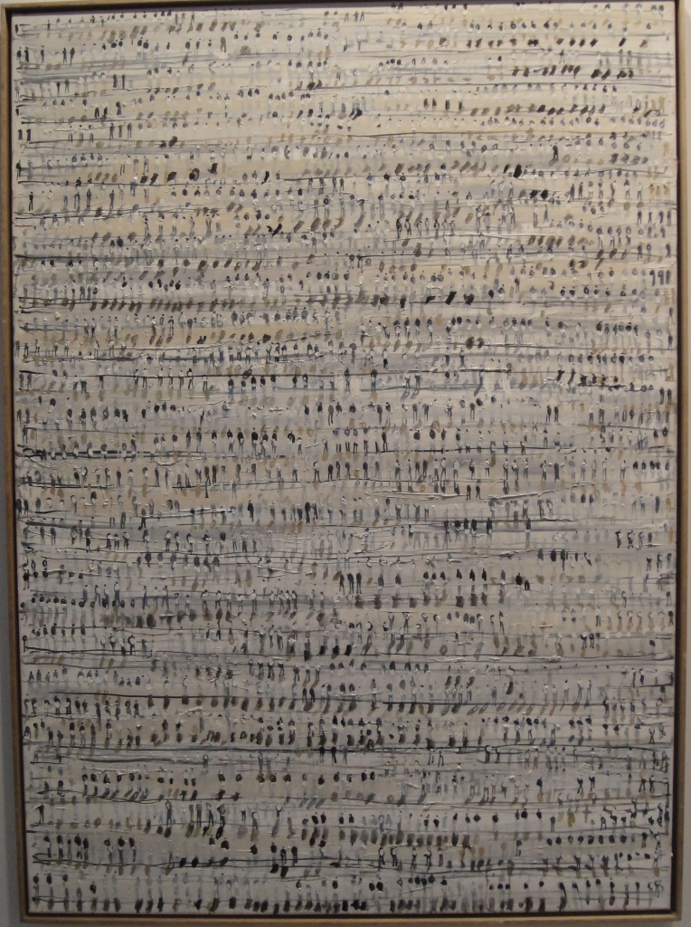 Precisamente esta fotografía de Schlör me atrajo pero ya estaba vendida. Estaba estampada en cristal que le daba una textura que no pude reproducir en la foto. Las siluetas de Hartmann son muy sugerentes un ejercito de cabezas y cuerpos estilizados que se convierte en la distancia en ceros y unos. Un abrazo