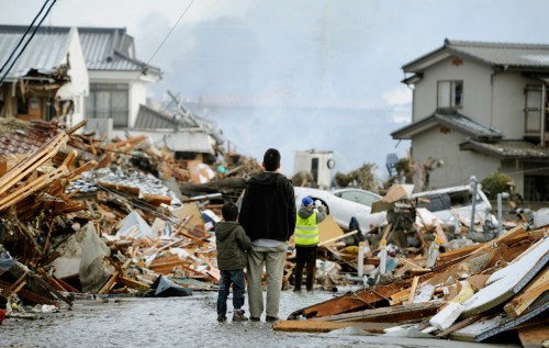 12 de marzo. Un padre y su hijo observan las casas devastadas un día después de que un tsunami y un terremoto azotaran el noreste de Japón. (Kyodo/Reuters)