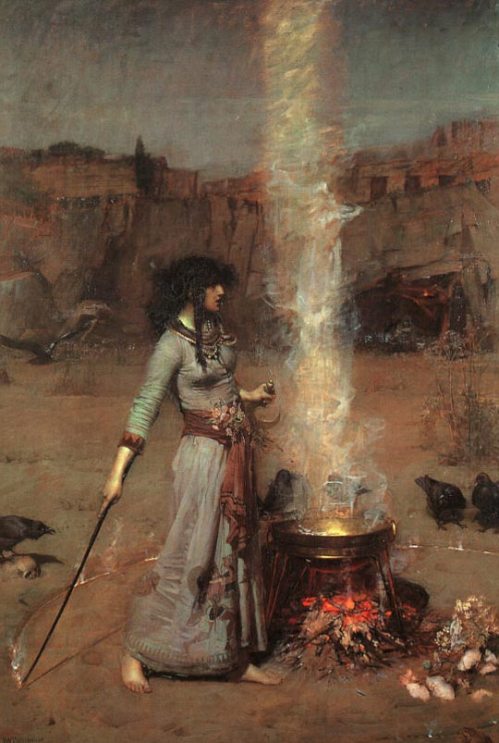 El cuadro es realmente inquietante. Ese humo que sale del caldero prácticamente como una columna, vertical, recto. La maga/bruja tiene un rostro extraño, parece masculino. Y la posición de los pies es rara, no? Ler da un movimiento tremendo ya que nos da al mismo tiempo la impresión de estar trazando el círculo y de estar echando algo al fuego (su mano izquierda). Y las fieles aves negras que, por su bien, prefieren permanecer fuera del círculo.
