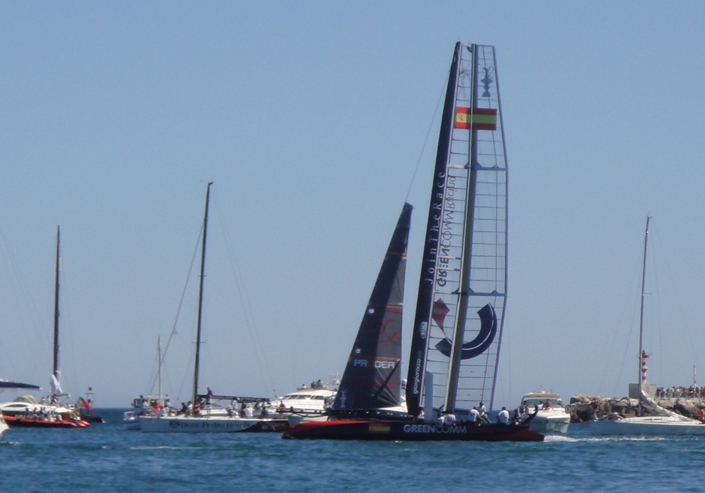 Comienza las regatas. 40 minutos entre la playa y la marina. Los catamaranes rasgan las aguas al unísono. Cascos que se cruzan, giros ceñidos. Las tripulaciones apuran metros en cada manga. Las velas dibujan manchas impresionistas sobre un mar esmeralda. El Flying Emirates pierde un tripulante y termina segundo tras el Oracle Team USA a tan solo 23 segundos. Qué espectáculo tan increíble. En la prueba de 500 metros, los catamaranes alzan sus cubiertas a escasos metros de la playa. Yo animo al Green Comm, el equipo de Españapero será el Flying Emirates de Nueva Zelanda el que consiga los 42.5 km/h de la victoria.