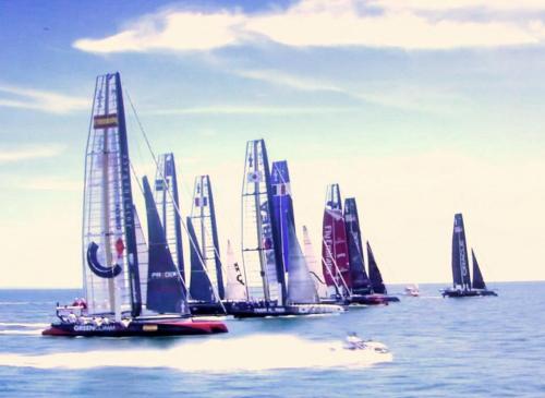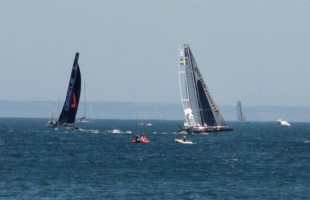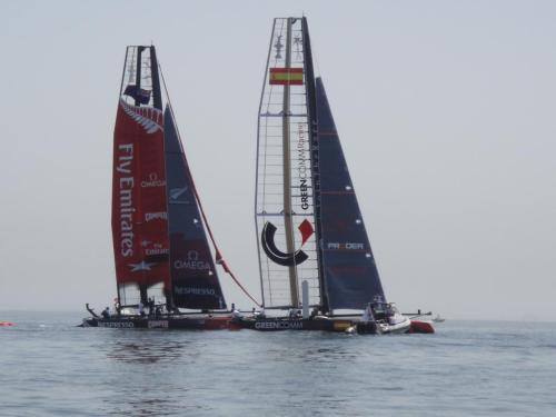 3:00 pm. Nueve catamaranes dibujan estelas sobre la bahía. Giros rozando cascos, mangas de vértigo, velas tensadas con la brisa. El equipo de Dean Barker encuentra mas viento en la segunda manga y se impone a los dos Oracles y al Artemis que finaliza segundo. Pero la sorpresa la dará la tripulación del GrennComm que termina quinta, la mejor puntuación española de la semana. Al final champán y abrazos. Los rostros se relajan y celebran su esfuerzo titánico. El público aplaude desde cubiertas y playas.