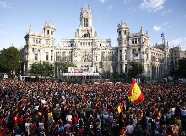 Recorro las calles del centro entre los edificios imponentes que abandoné en julio. Da la impresión de que circulan menos coches, las tiendas están más vacías y que las gentes se entretienen menos en las calles. La crisis aprieta todos los cinturones. Sin embargo Cibeles bulle a las seis y media. Una marea de almas alzando las palmas. Sobre un palco improvisado la Selección exhibe la segunda Copa de Europa.