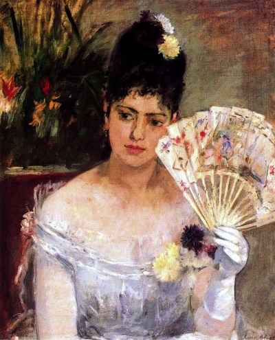 1875. Berthe se presenta al Salón de Impresionistas. Una mujer descansa tras un abanico. Me encantan las transparencias del vestido y las varillas de nácar. A mí me conmueven la mirada y la piel de porcelana. Delante, una joven se observa en el espejo de su cámara. Escena íntima y delicada. El rostro ladeado, el cabello recogido. Mi madre se emociona. No conocía a esta gran artista.