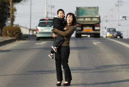 Yuko Sugimoto y su hijo Raito donde la fotografiaron el año pasado tras el terremoto y tsunami de Ishinomaki, Miyagi, Japón.