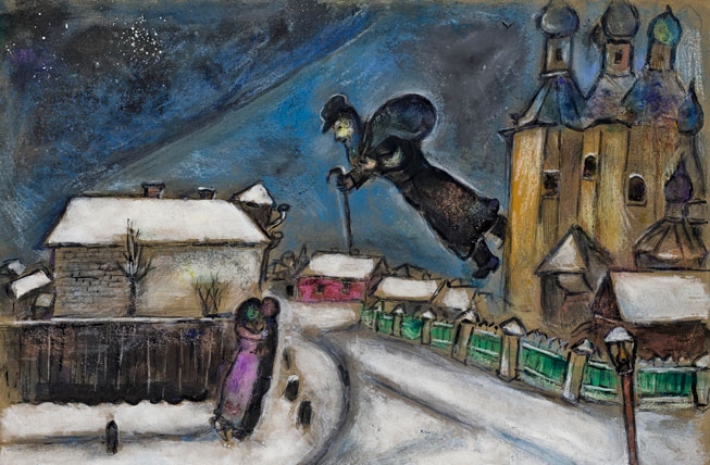 Calles cubiertas de nieve, chimeneas humeantes, violinistas y vendedores ambulantes. Y al fondo, las cúpulas de Vitensk, el hogar de la infancia. El poeta sueña sobre la hierba fresca. Los recién casados observan el futuro a través de la ventana. Telas cargadas de verdes primarios, carmines apasionados y azules orientales. Telas cargadas de magia.