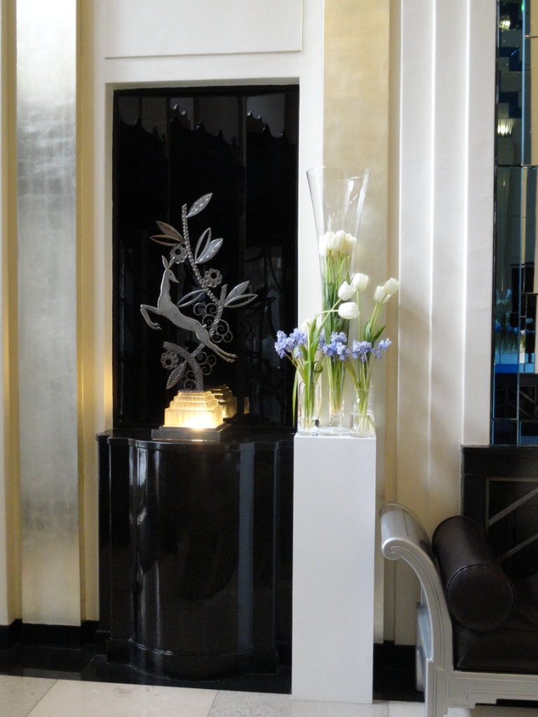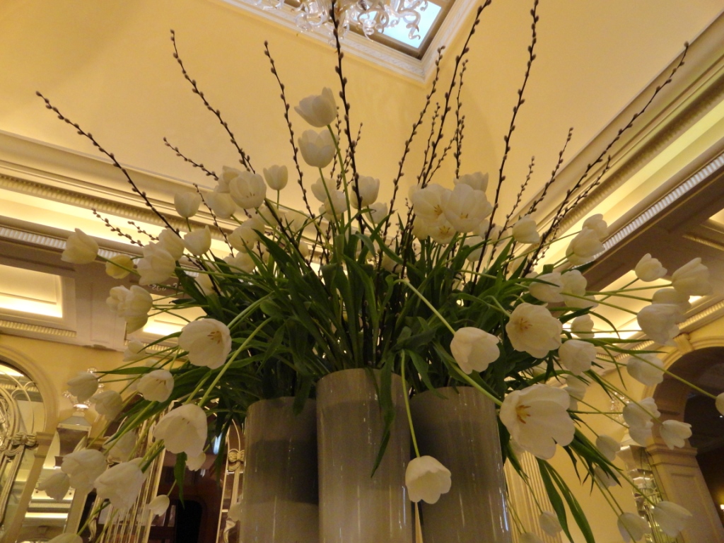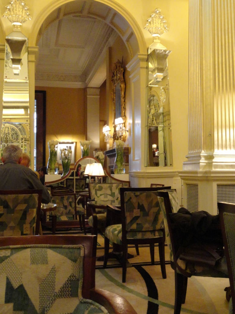 Llegamos al Claridge’s a las 5. Glenn nos saluda con una sonrisa cálida mientras nos acomoda bajo un espectacular centro de tulipanes blancos. Una taza de Royal Blend y unos scones me caldean el cuerpo entumecido por tanta lluvia. Admiro en silencio las columnas plateadas, los espejos biselados, los detalles Art Decó que tanto me gustan. Un piano y un violín endulzan mis oídos con melodías de los 30. Una maravilla.