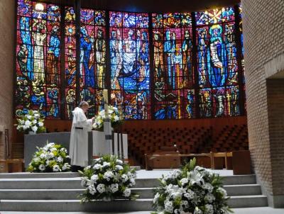Me sorprende la vidriera y el crucifijo gigante sujeto por cables de acero. Y las flores blancas. Juan nos saluda desde el lateral y nos indica nuestro lugar en el banco de la familia, junto a los que no queremos recordar y mucho menos ver. El diablo aparece sobre tacones de aguja. Entierro los ojos en el misal para evitar su mirada.
