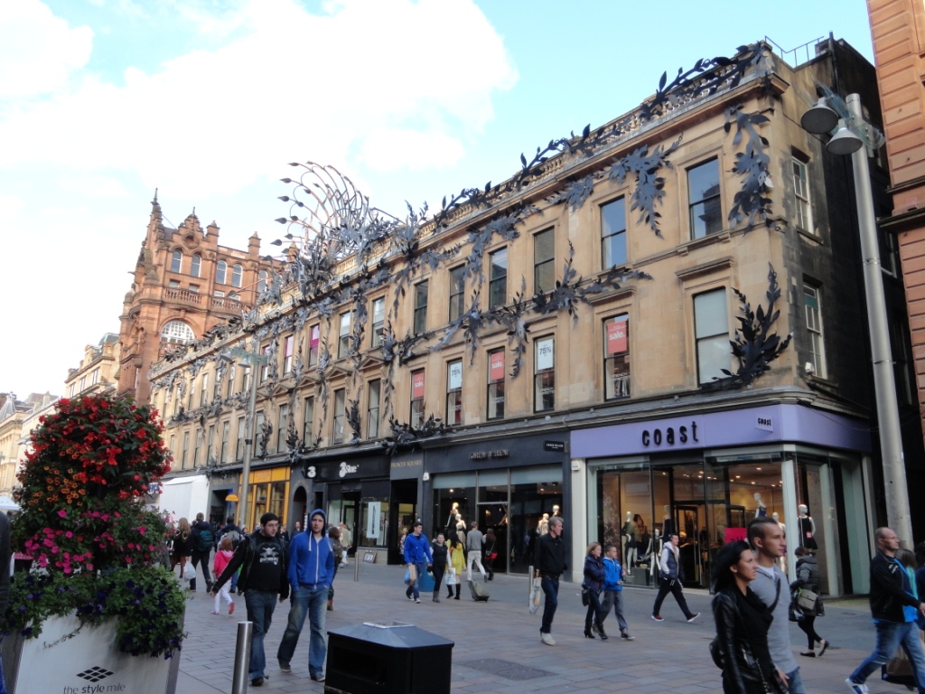 Dejamos las maletas en el hotel y salimos a dar un paseo. Descubro un pequeño anticuario que vende plata Decó a buen precio. Primera alegría del viaje. Continuamos hacia Buchanan St. con sus tiendas y edificios victorianos, llenas de jóvenes en pantalón corto y melenas rizadas. Glasgow es una ciudad de estudiantes.