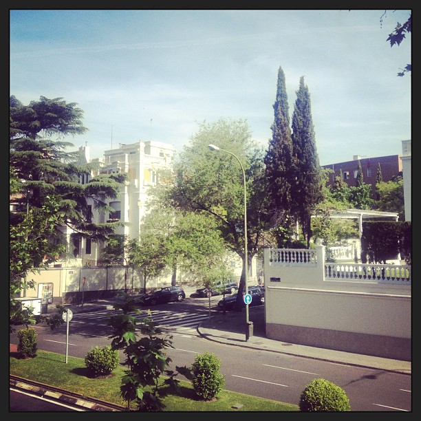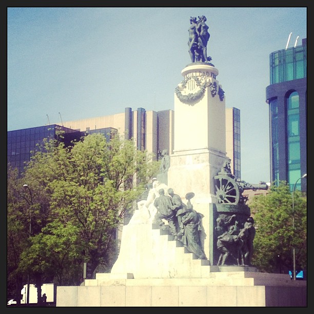 Continúo hasta la plaza de Emilio Castelar donde un pedestal de piedra blanca reluce ajeno al barullo de motores que lo bordean. A los lados filas de plátanos cuajados de brotes nuevos. Cruzo bajo el puente de Juan Bravo salpicado de esculturas. Qué buena idea haber dispuesto aquí un museo al aire libre. Mas allá el edificio de la Mutua bordeado de rosas y margaritas. Qué bonito esta Madrid en primavera.