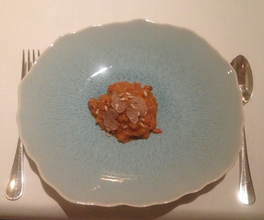 Para comenzar un macaron de remolacha con algas, toque dulce y salado para abrir las papilas gustativas. Como entrantes unas verduras tratadas como granos de arroz cremoso con lonchas de trufa blanca, un liquen untuoso con algas, original en el paladar y unas papas negras de Canarias muy tiernas. Para los no vegetarianos pollo de corral con extracto de hongos y entrecot con alcachofa y trufa negra.