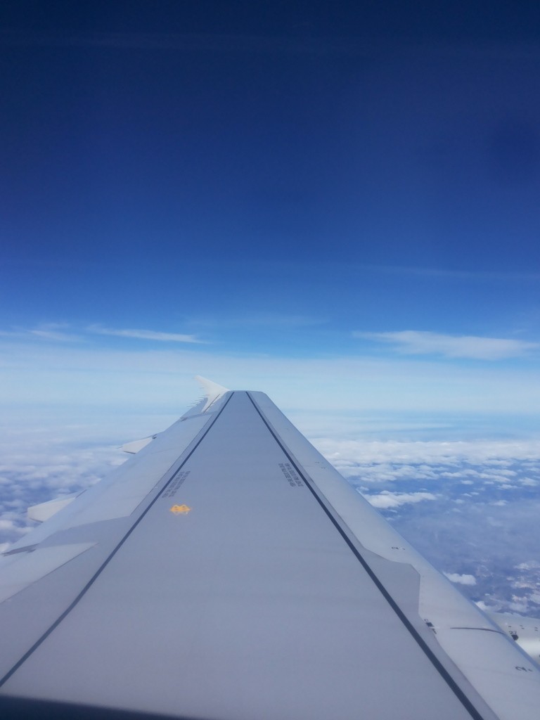 Otro avión, otra vuelta a casa. Miro adormecida por la ventanilla de la salida de emergencias y me deslumbra el añil de un cielo impoluto. Abajo nubes como algodones de feria, de cuando en cuando un zigzag de nieves que parecen suspendidas en el infinito. Y en el centro la imagen afilada del perfil metálico del ala.