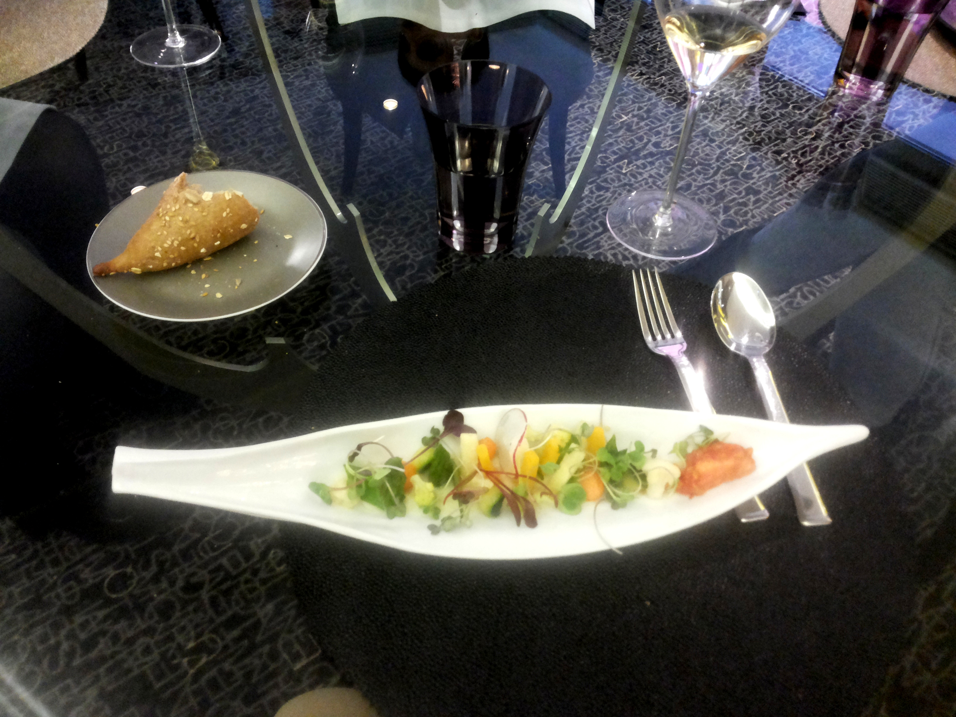 Verduritas sobre una góndola de puré, arroz en costra con gamba roja y una soberbia ensalada de bogavante de texturas delicadas y paladar auténtico. La propuesta de Mario Sandoval nos enamora. Merecidísima la estrella Michelín que ostenta en su restaurante de Humanes, Coque.