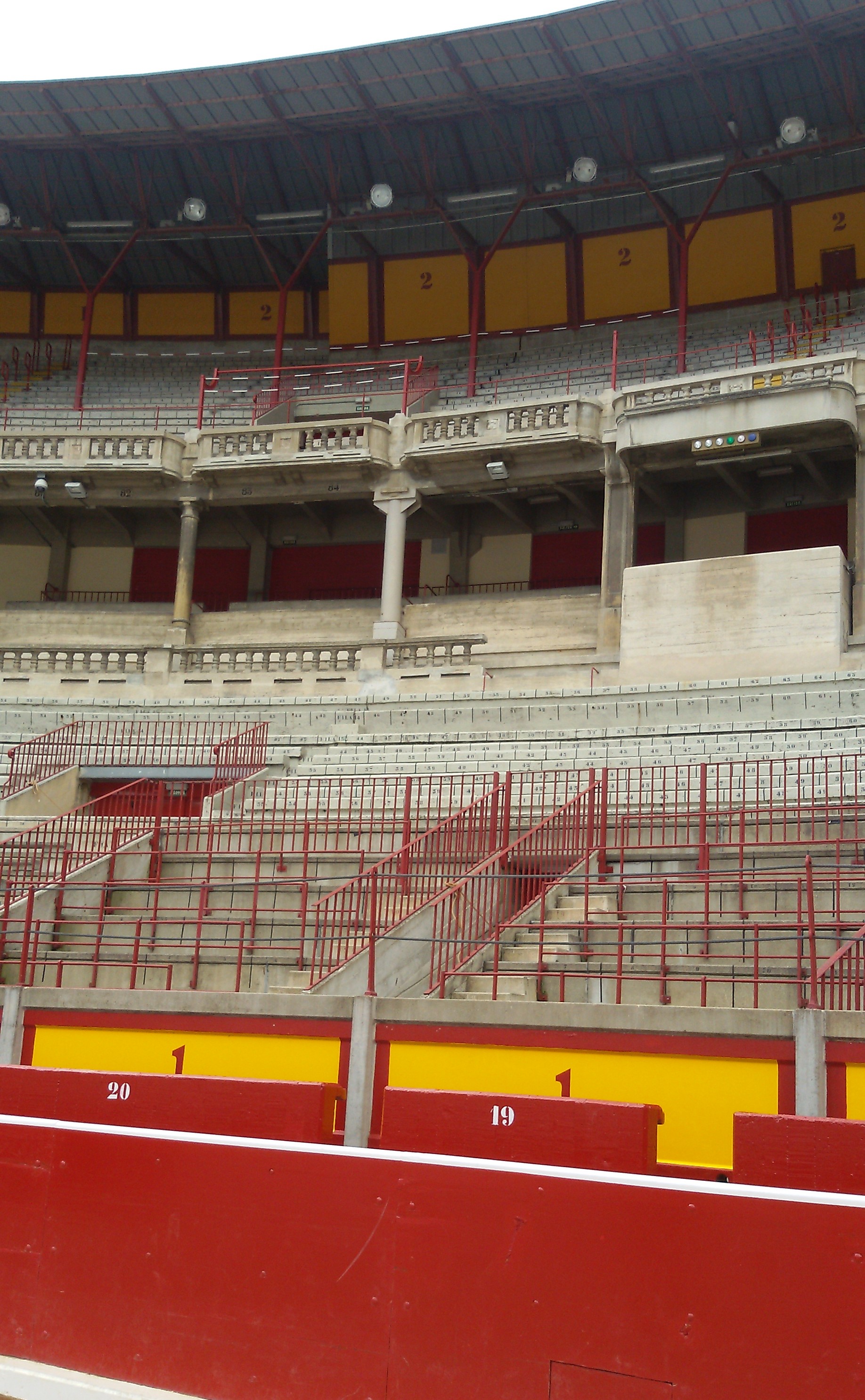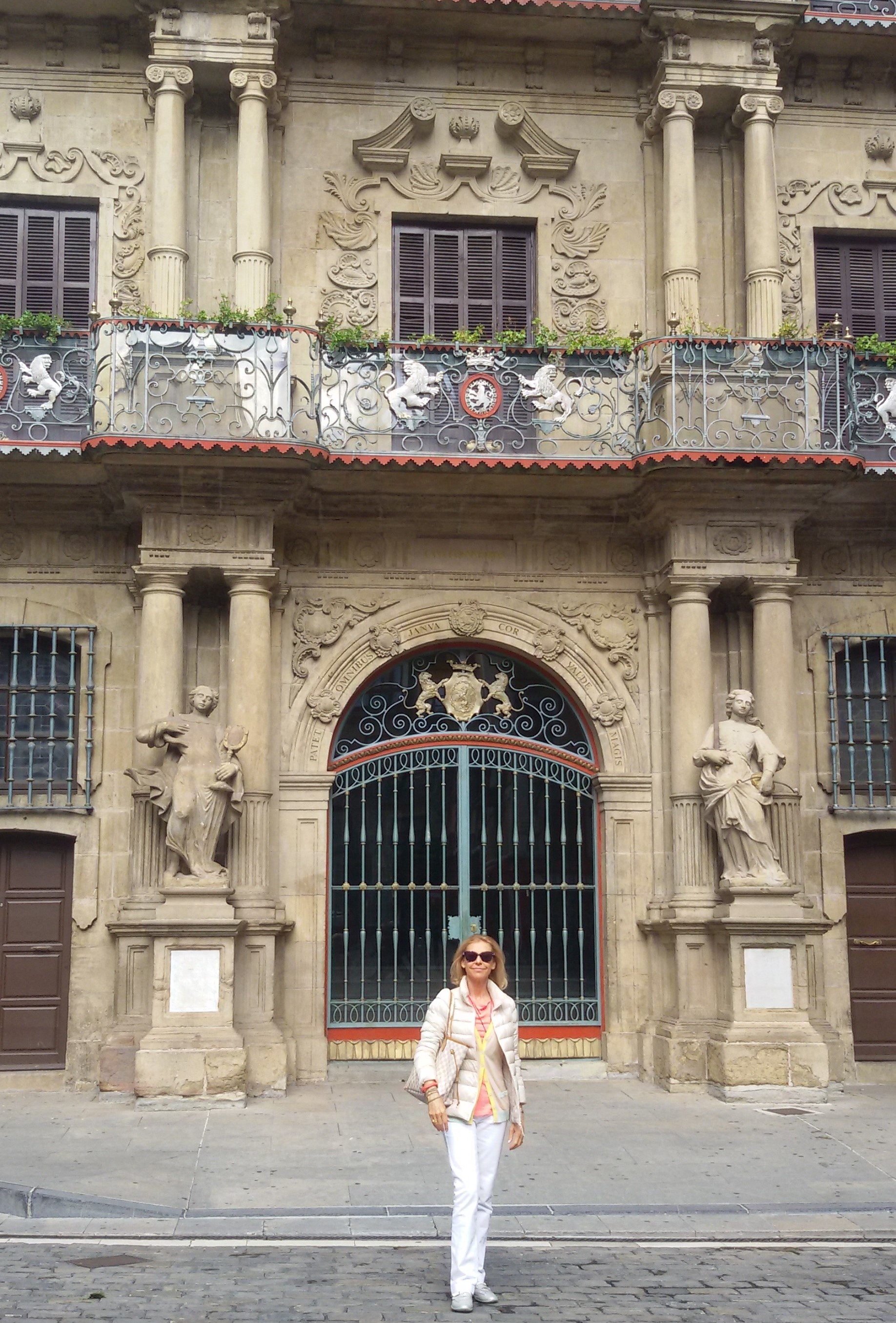 Primera parada, El ayuntamiento, desde cuyo balcón cada julio se lanza el famoso chupinazo que marca el inicio de Los Sanfermines, en el cruce de los tres burgos que constituyen Pamplona, (Navarrería, San Saturnino y San Nicolás) unificados en 1423 por Carlos III. Bajamos por la Estafeta hasta la Plaza de toros a paso ligero. No tan ligero como el de los miles de mozos que la recorren de blanco entre astas de toros bravos. De blanco y pañuelo rojo, que representa el martirio de San Fermín y sólo se anuda al cuello mientras duran las fiestas. En la Plaza encontramos el coso inundado de marisco gallego, una feria regional se celebra estos días.