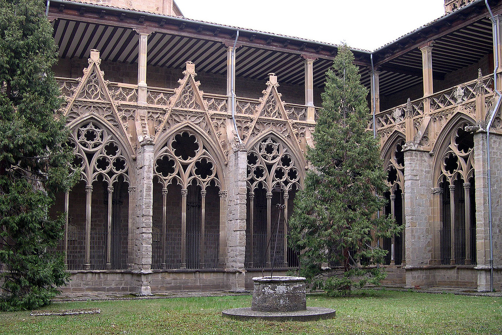 De vuelta nos desviamos al este hasta la catedral de Santa María la Real. Tras la magnífica fachada de Ventura Rodríguez, el templo gótico que data del s XIV y XV. La nave central de casi 30 m de altura iluminada por sobrias vidrieras guarda el sueño de Carlos III y la reina Leonor. En el altar, la talla románica revestida en plata de la virgen, junto al claustro, joya de la catedral que bien merece una visita. Volvemos al centro.