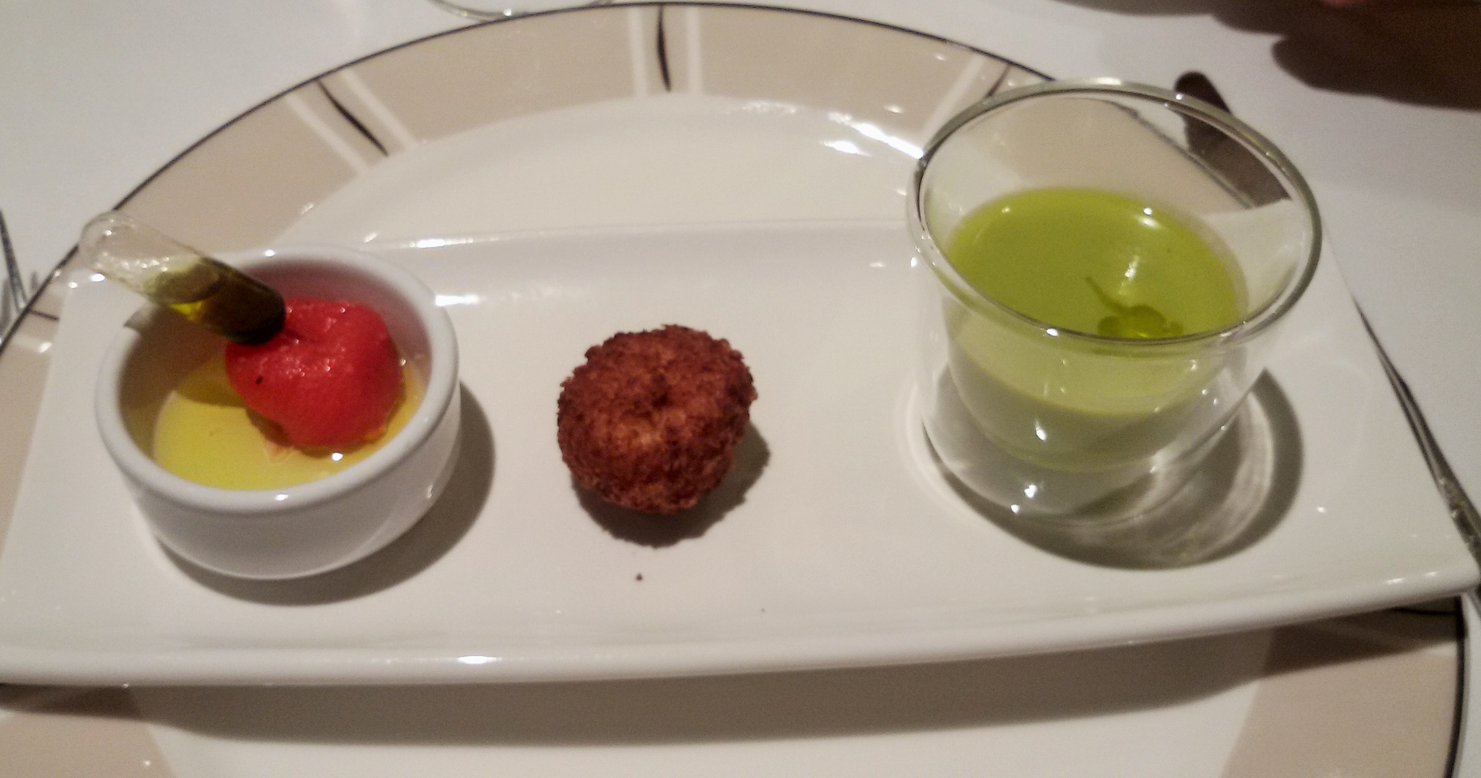 Para comenzar, un tomatico pelado con ampolla de vinagreta, una croqueta de bacalao y una crema de habitas, que ya nos anunciaban la calidad de la comida que nos esperaba. Después llegaron los pimientos de piquillo de temporada, asados con leña con papada de cerdo ibérico que quitaban el habla, unas setas salteadas muy sabrosas, y unas judías con borrajas hiladas con aceite de oliva virgen y jamón serrano deliciosas. La presentación impecable. El sabor difícil de describir si no se ha probado la cocina Pilar Idoate, chef del restaurante Europa que cuenta con una estrella Michelin.