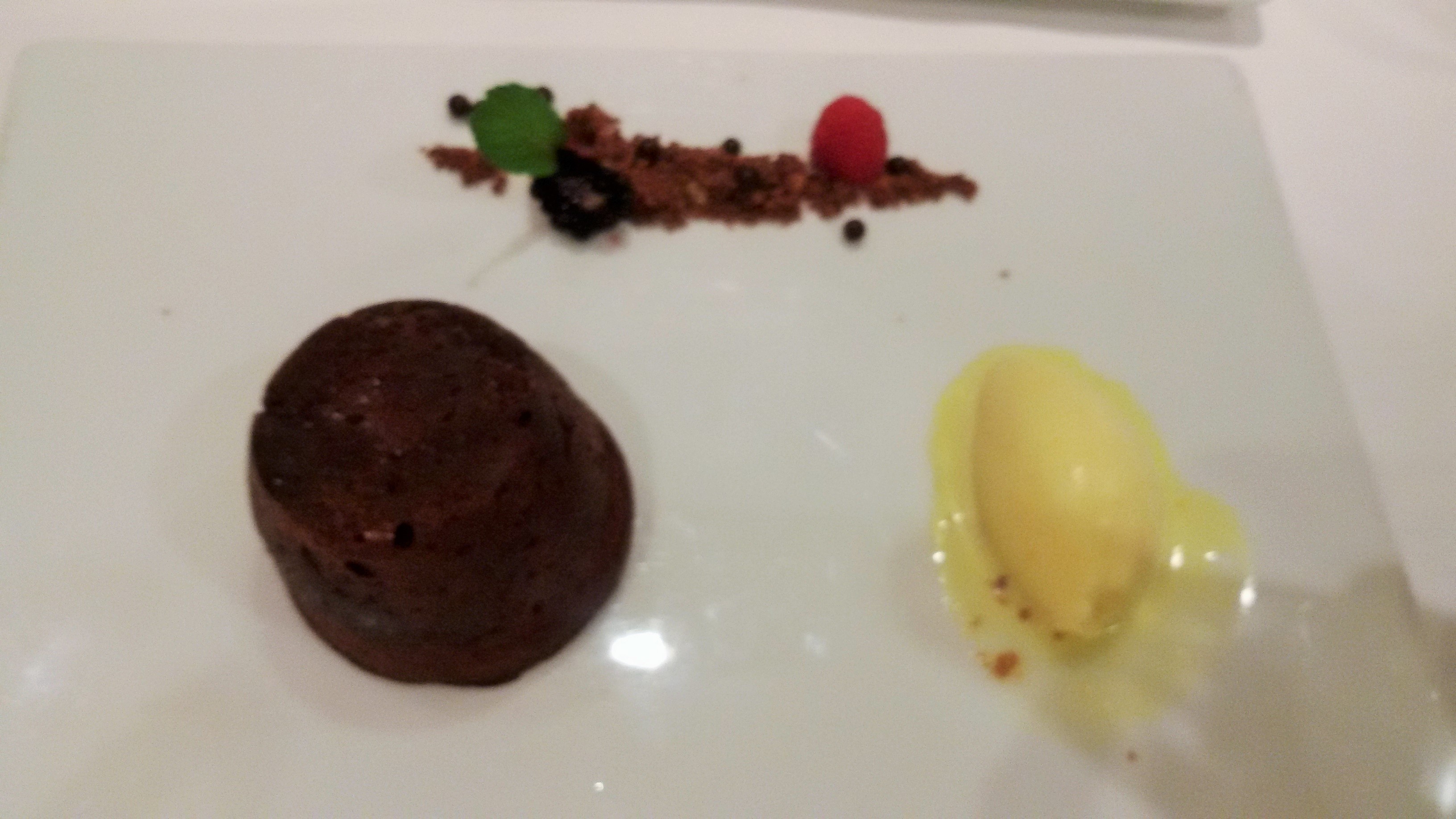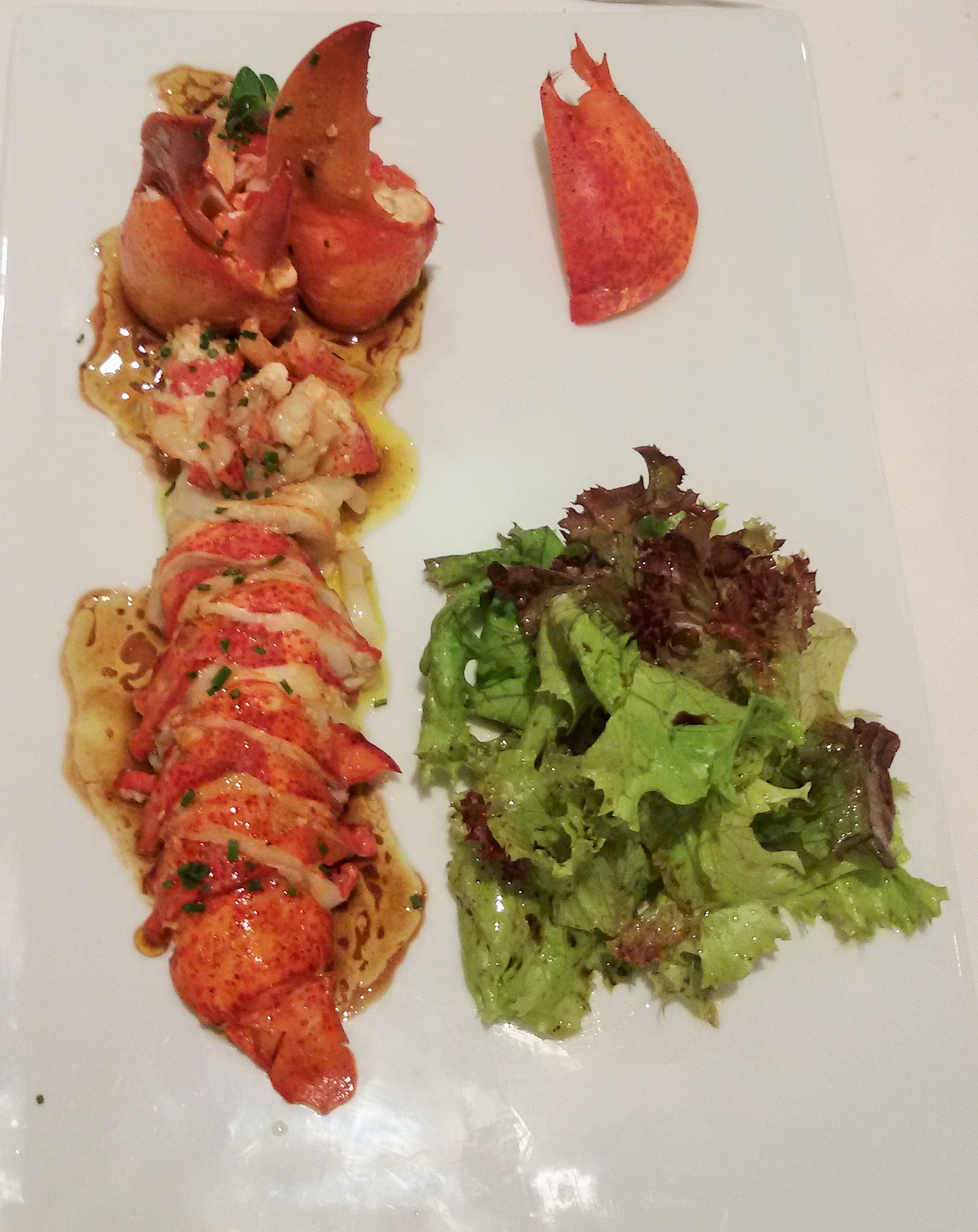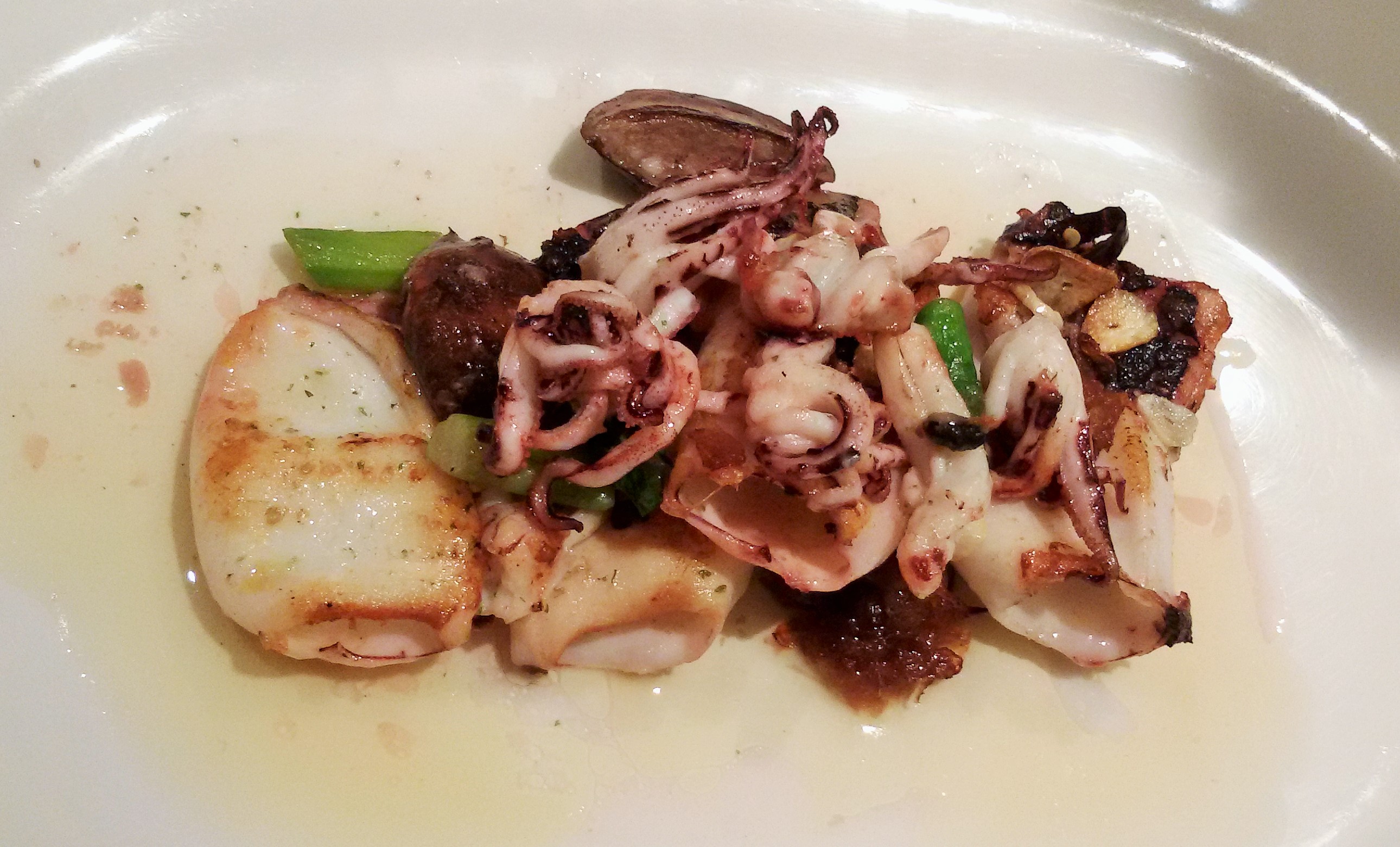 Para cuando llegaron los principales estábamos entusiasmados. Probamos el bogavante asado con verduritas, la merluza al horno en su punto, y los chipirones a la plancha con textura de terciopelo que se deshacían en el paladar. Los mejores que he probado hace tiempo. Y eso que en Pamplona no hay costa. Todo ello regado con un Mauro V.S. 2007, tempranillo 100% de fabulosa añada. Estuvimos de acuerdo en lo complicado que resulta a veces disfrutar de la comida en restaurantes con estrellas Michelin, más interesados en la innovación que en la el resultado de sus experimentos.