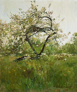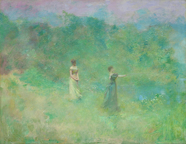 Whistler, eterno expatriado, influirá sobre estos pintores a los que nunca se unió formalmente. Su pintura monocroma, sutil y poética esta en la base de las series de invierno de Twachtman, del que me llama la atención una delicada mañana de mayo. Y más tarde en Dewing, con un sutil juego de figuras en un verano bellísimo, y Chase, el pintor de las colinas de Shinnecock. La exposición nos estusiasma. El impresionismo es uno de nuestros movimientos favoritos. Otra gran oportunidad para conocer artistas nuevos de la mano del Thyssen.