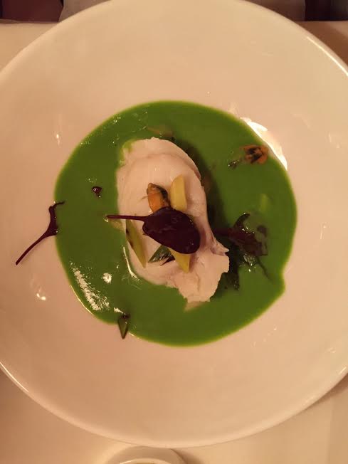 Balacao al vapor sobre muselina de mejillón y puerritos a la plancha.