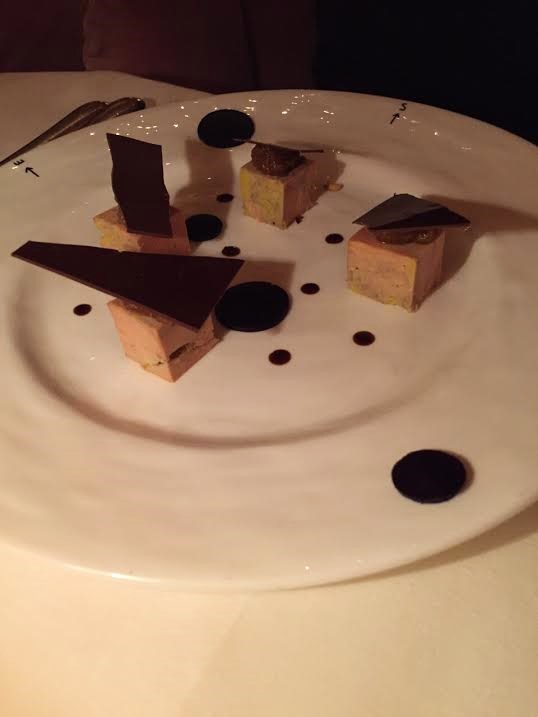 Terrina de foie gras con cobertura de chocolate,pasta de higo amontillado, sirope de remolacha y mermelada de lombarda.
